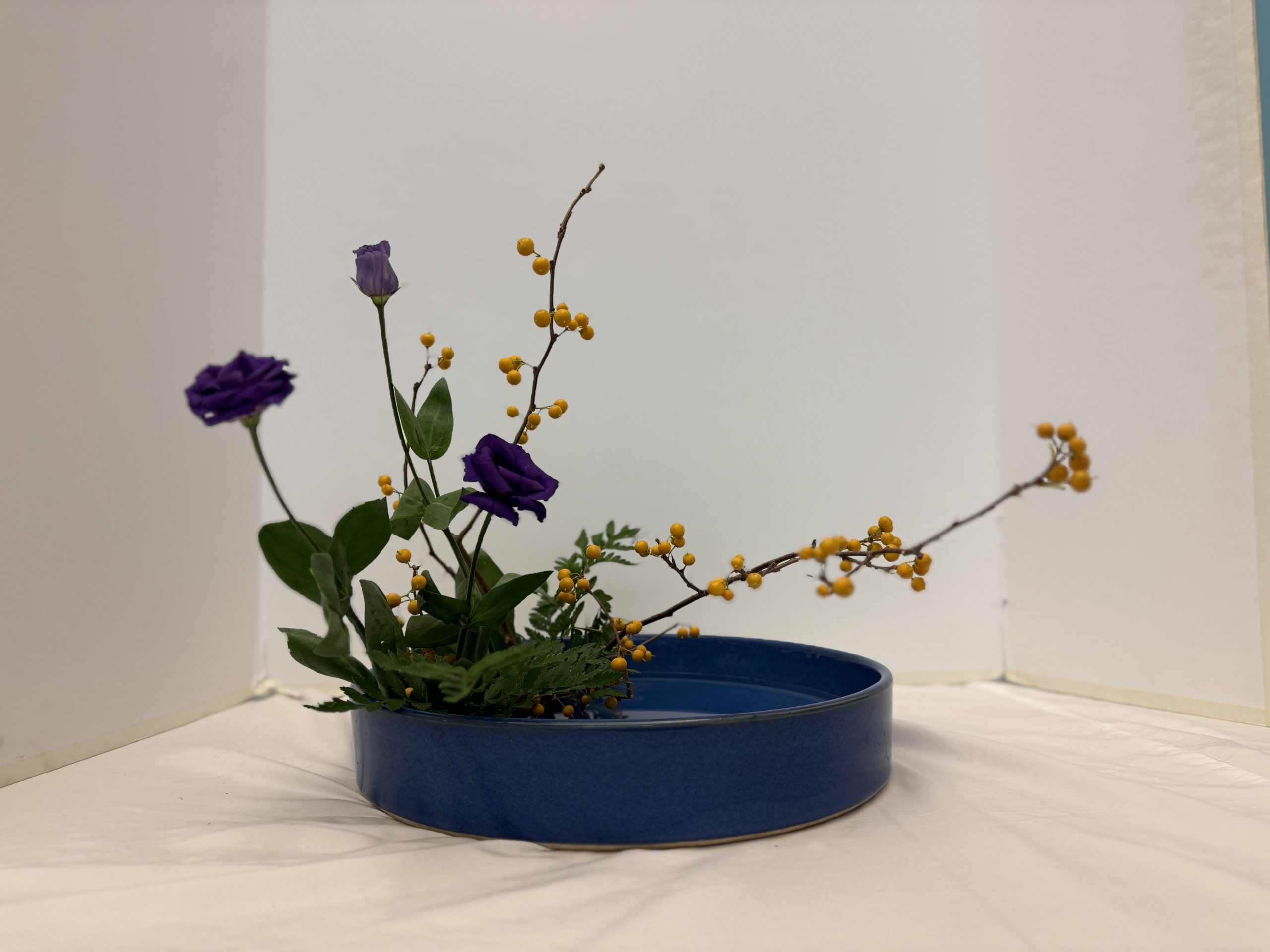 De ochtend begon om 9.30 uur met koffie en thee, een warm weerzien voor velen en een rustig moment om elkaar te begroeten. Na de ontvangst volgde de eerste workshop: een Moribana schikking in de waterreflecting style (Kansui-kei). Deze stijl benadrukt het subtiele spel van water en reflectie, waarbij bloemen en takken in harmonie met hun spiegelbeeld worden geschikt. Onder de rustige en deskundige begeleiding van Master Yans-Izumi ontstonden verfijnde composities die de essentie van zomer en sereniteit uitdrukten.